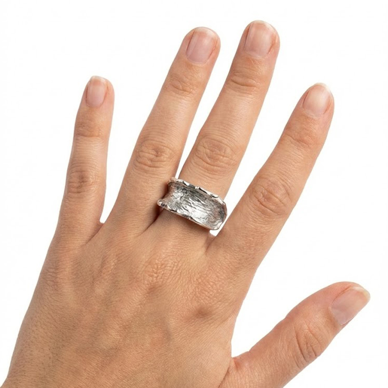 Anillo macizo de plata texturado. Diseño abierto, ajustable desde la medida 11 hasta la 17.