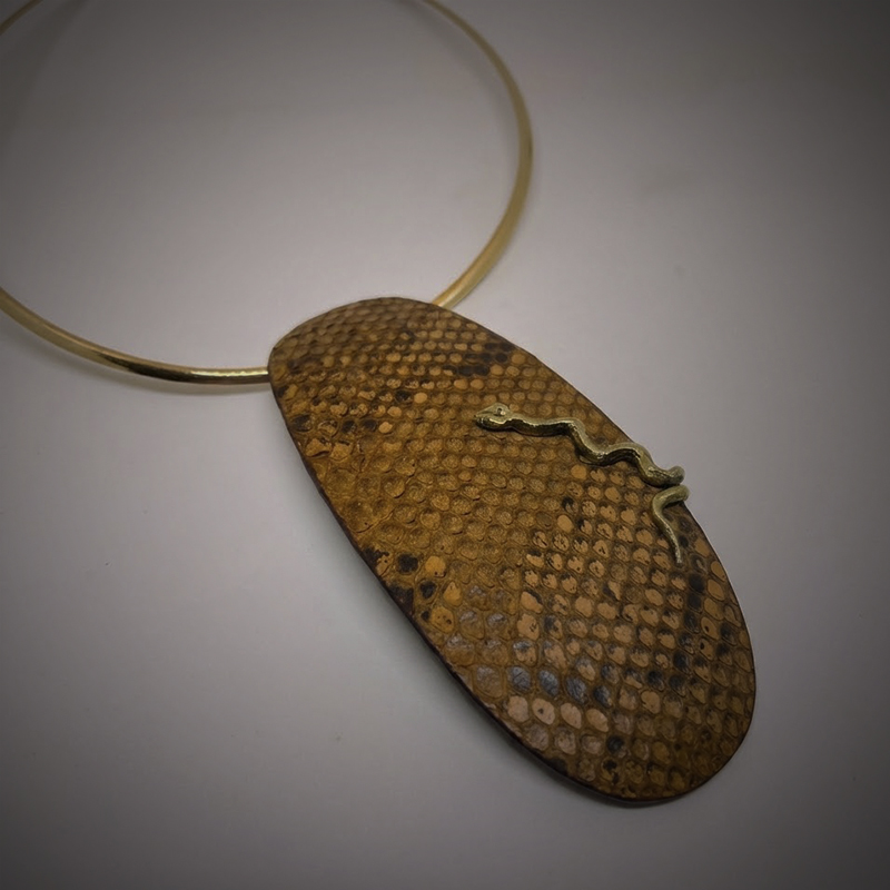 El colgante está realizado con piel de serpiente natural, con pequeño detalle del animal trepando por él, realizado en latón y envejecido.